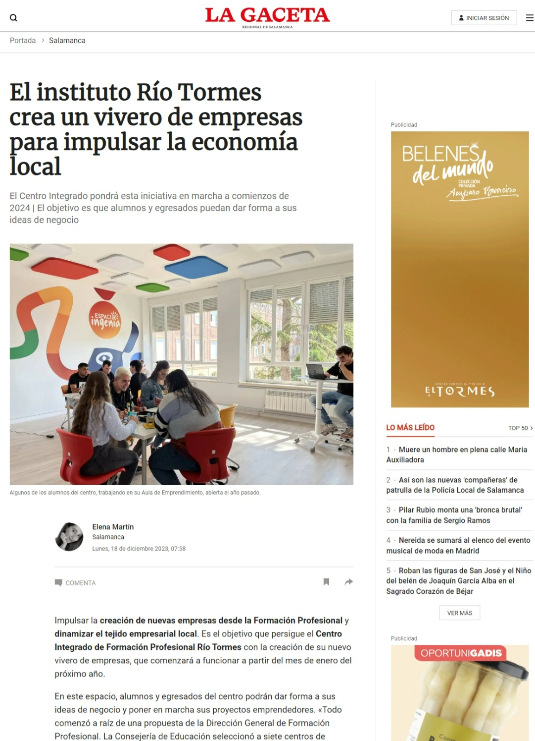 El Vivero de Empresas, uno de nuestros nuevos proyectos en este curso 2023-24, es noticia hoy en La Gaceta de Salamanca.