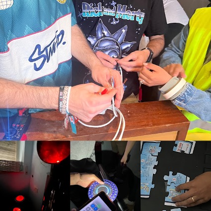 - En la segunda sala temática sobre riesgo ELÉCTRICO, los alumnos de Prevención han generado un cortocircuito que los jugadores deberán medir con un voltímetro para descubrirlo. Posteriormente, tendrán que encontrar el puzle que contiene las 5 reglas de oro para trabajos eléctricos para poder salir de la habitación.